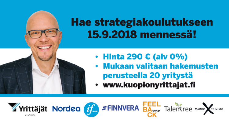 Mikä erottaa yrityksesi kilpailijoistasi nyt ja tulevaisuudessa? Onko yritykselläsi kasvutavoitteita, aikomus työllistää enemmän henkilökuntaa tai kansainvälistyä? Kristallinkirkas strategia on yrityksellesi menestymisen tae – hae mukaan koulutukseen täyttämällä hakemus täällä!