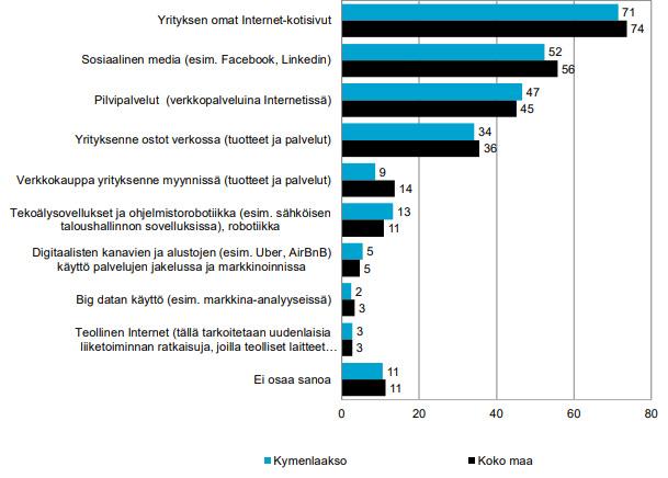 Kymenlaaksossa alle 10 % yrityksistä tarjosi palvelujaan verkkokaupassa. Erilaisten tekoälysovellusten hyödyntäminen näkyi esimerkiksi taloushallinnon sovelluksissa, joskin sekin varsin pientä. Digitaalisten alustojen käyttö palvelujen jakamisessa tai markkinoinnissa, big datan käyttö (esimerkiksi markkina-analyyseissä) tai teollisen internetin hyödyntäminen oli käytössä vain muutamalla prosentilla vastaajista.