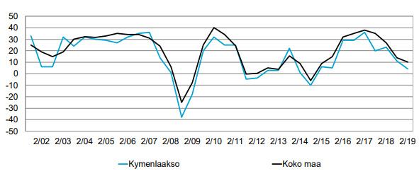 Kymenlaakson alueen suhdannenäkymät henkilökunnan määrän suhteen ovat koko maata heikommat. Kasvuhakuisuus on laskenut koko Suomessa, mutta Kymenlaaksossa viime vuonna oli orastavaa nousua, mikä on nyt kääntynyt laskuun. Vain kolmannes vastanneista yrityksistä uskoi kasvuun keväällä 2019.