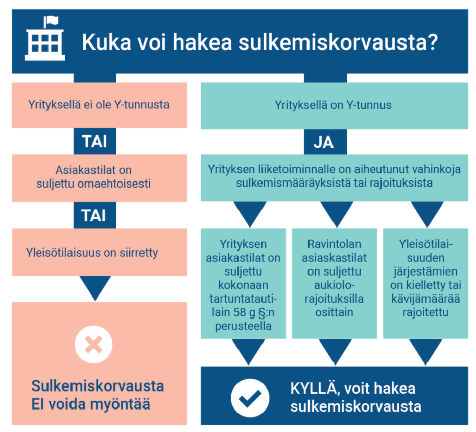 Sulkemiskorvausta voi hakea, jos yrityksen toimitiloja suljettiin tai aukioloaikoja rajoitettiin koronapandemian hallintaan liittyvän säädöksen tai viranomaisen määräyksen perusteella 21.12.2021–28.2.2022 välisenä aikana.