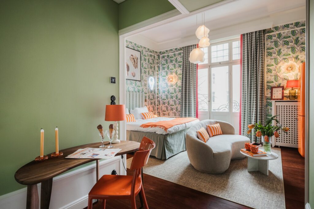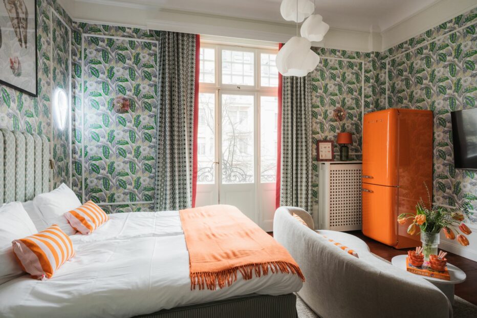 Jäätelöhotellihuone on sisustettu yhteistyössä arvostettujen pohjoismaalaisten ja kansainvälisten brändien kanssa. Jäätelön eri muotoja ja värejä edustavat muun muassa kattolamppu, sohva ja tyynyt.