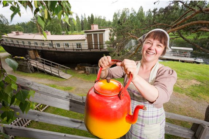 Kahvila toimii Möhkössä asuntoproomussa, joka oli aiemmin savottakämppä.