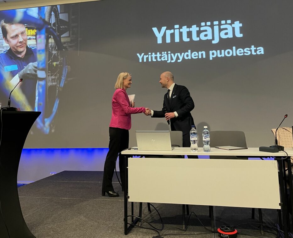 Valtiovarainministeri Riikka Purra oli tiistaina puhumassa Suomen Yrittäjien valtuuston kokouksessa, ja Yrittäjien norminpurkulista luovutettiin hänelle tässä yhteydessä.