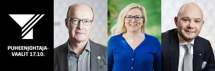 Otsikkokuvassa puheenjohtajaehdokkaat Antti Rantalainen, Nina Rasola ja Petri Salminen.