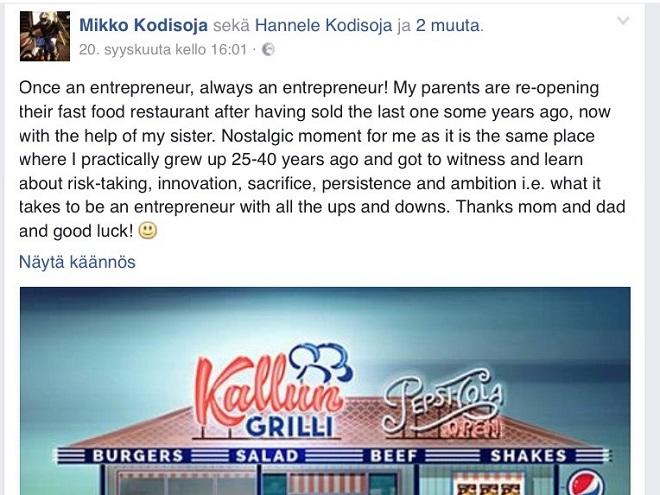 Mikko Kodisoja kirjoitti tunteikkaasti vanhempiensa paluusta grilliyrittäjiksi Facebookissa viime vuoden syksyllä (vapaasti suomennettu englannista):