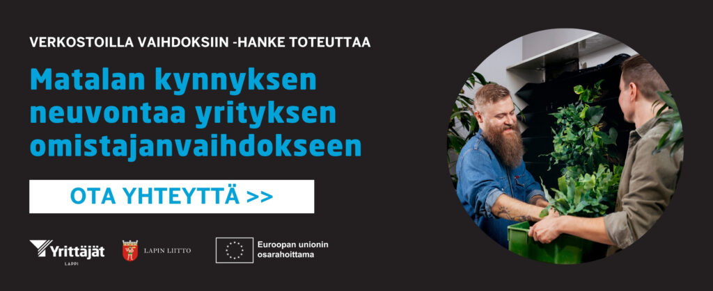 Lapin Yrittäjien koordinoima Verkostoilla vaihdoksiin -hanke tuottaa omistajanvaihdosneuvontaa Lapissa. Palvelu on maksuton ja sitä voi hyödyntää niin yrityksen ostamisesta, myymisestä kuin sukupolvenvaihdoksesta kiinnostuneet.