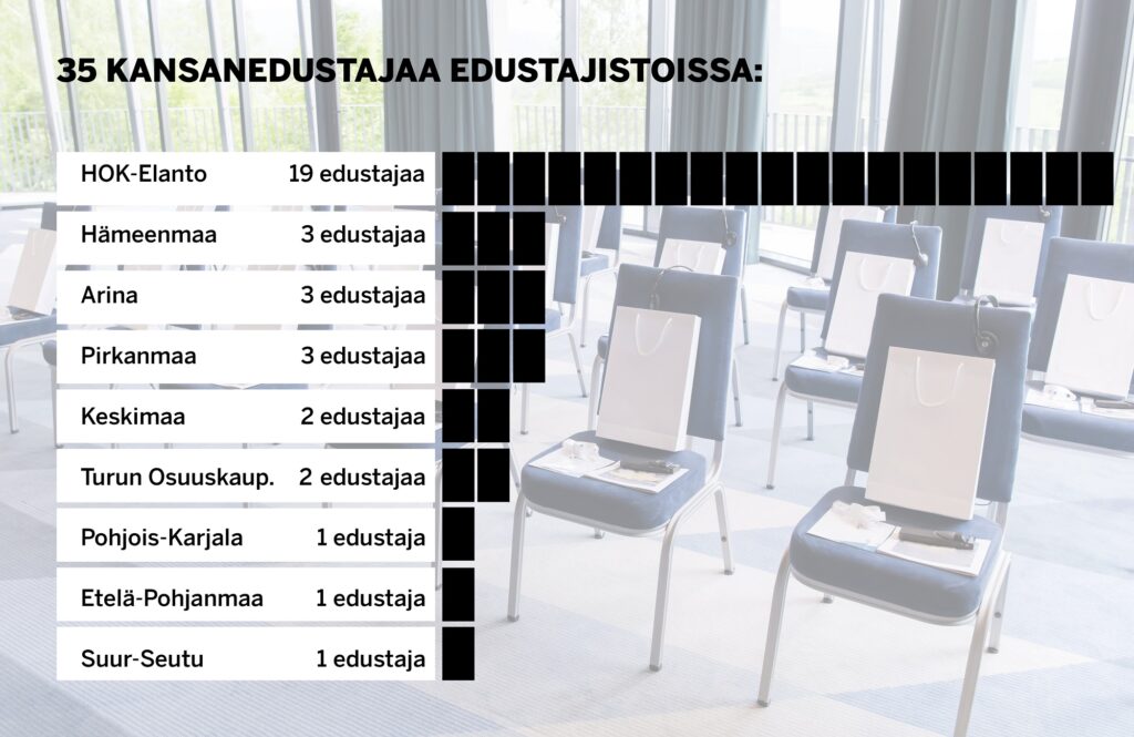 Suomen Yrittäjien selvitys osoittaa, että kaupunkien ja kuntien sekä maakuntien valtuustojen ja hallitusten sekä kansanedustajien paikoista on 796 osuuskauppojen edustajistossa ja hallintoneuvostoissa istuvilla poliitikoilla. HOK-Elannossa muutama henkilö on lisäksi sekä edustajiston että hallintoneuvoston jäsen.