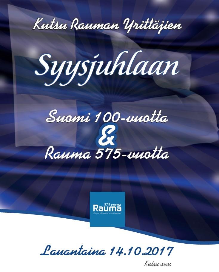 Rauman Yrittäjien perinteiset syysjuhlat vietetään tänä vuonna 14.10.2017 klo 18 alkaen Ooperissa. Kutsumme kanssamme juhlimaan kaikki jäsenet, yhteistyökumppanit ja yhteistyötahot. Juhlavuoden kunniaksi teemana on Suomi 100 -vuotta ja Rauman 575 -juhlavuosi.