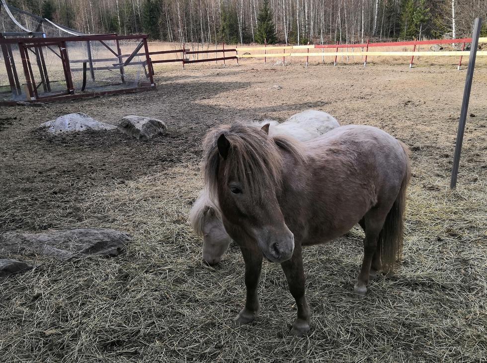 KUVASSA ON tilan kaksi ponia, Tatu ja Norton. Tai oikeastaan toinen niistä on virallisesti kylläkin virallisesti amerikanminiatyyrihevonen. Se on hieman hassusti melko selvästi aitauksen varsinaista ponia pienempi.
