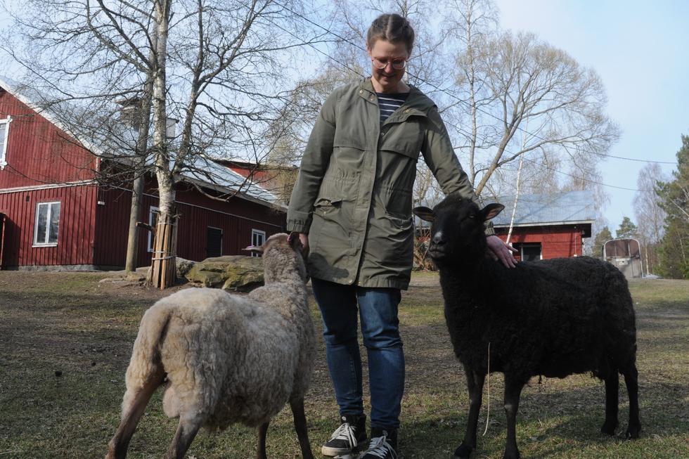 YRITTÄJÄ JA PARI lammasta eli Rokki ja Uuno. Kovasti karvapallot tuntuvat tykkäävän, että niitä rapsutellaan.