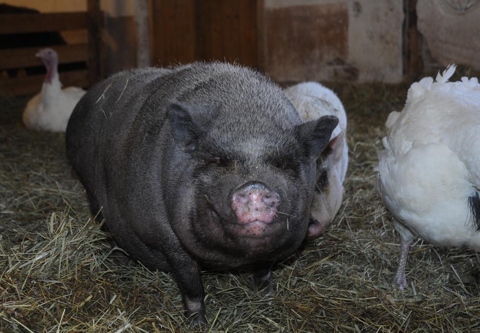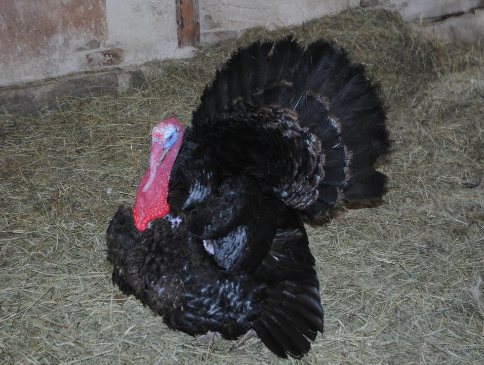Äänimaailma on sen mukainen. Possujen röhkinän lisäksi toisesta päädystä voi kuulla hanhen kotkotusta sekä keskimmäisessä karsinassa majailevien kalkkunoiden holotusta. Karsinan ainoalla uroksella, valtavan, punaisen heltan omaavalla kalkkunalla, on show päällä. Se keikistelee pyrstöllään ja koettaa tehdä neiteihin vaikutuksen. Ankkojen ja riikinkukkojen majapaikat löytyvät toiselta puolelta navettaa.