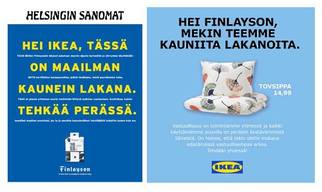 Finlayson ja Ikea julkaisivat keskustelua herättäneet mainoksensa tämän kuun alkupuolella. Finlayson mainosti Helsingin Sanomien etusivulla siirtymistään kartonkipakkauksiin ja luomupuuvillaan lakanoissaan ja haastoi Ikean tekemään saman perässä.