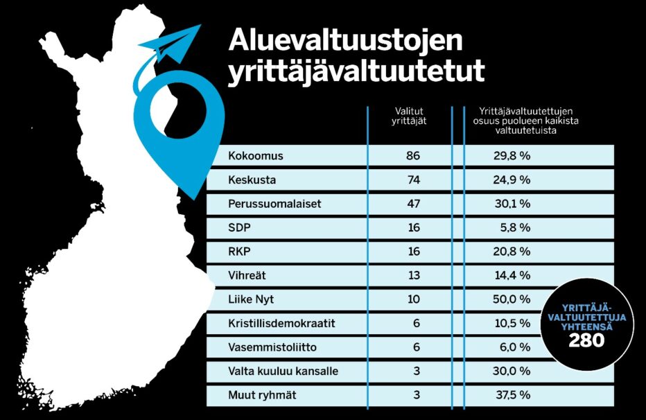 Sunnuntaina päättyneissä aluevaaleissa valtuustoihin valittiin yhteensä 280 yrittäjää koko maassa. Se on 20,3 prosenttia kaikista aluevaltuutetuista. Etelä-Pohjanmaan hyvinvointialueen osalta tarkka lukema on 44,1 prosenttia.