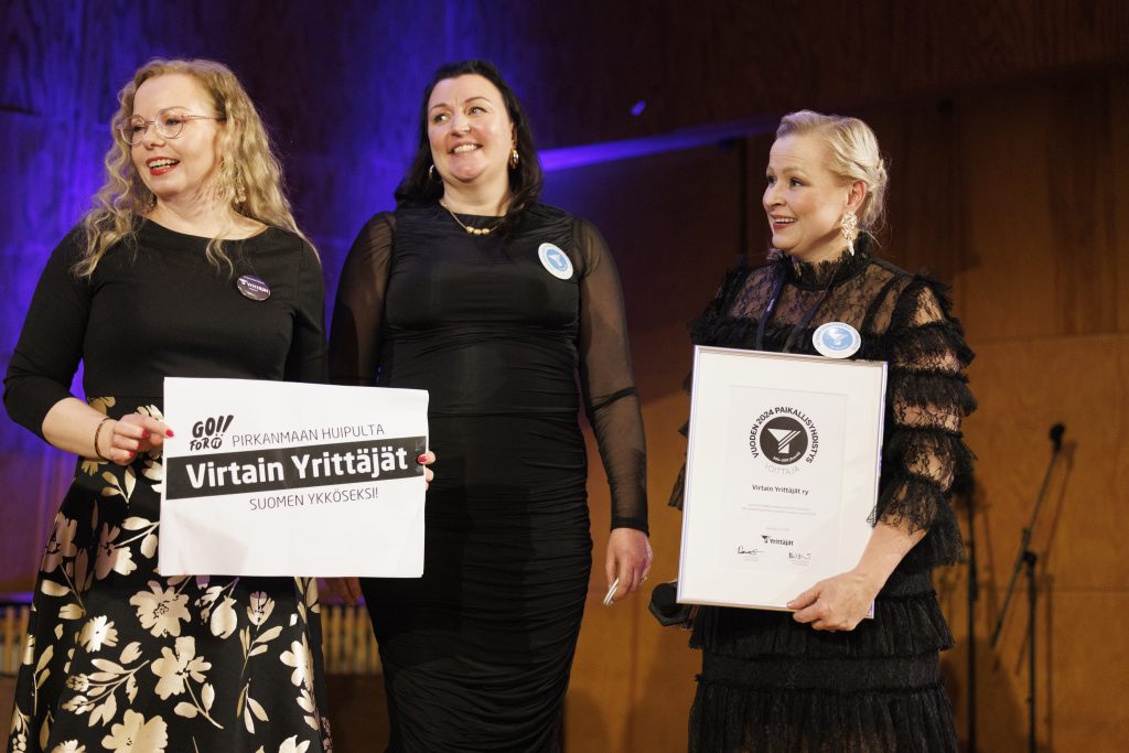 Virtain Yrittäjät palkittiin parhaana 100-200 jäsenen sarjassa. Kuvassa Eija Kantonen (vas.), Marja Haapanen sekä yhdistyksen puheenjohtaja Mervi Vilén. Kuva: Atte Kajova