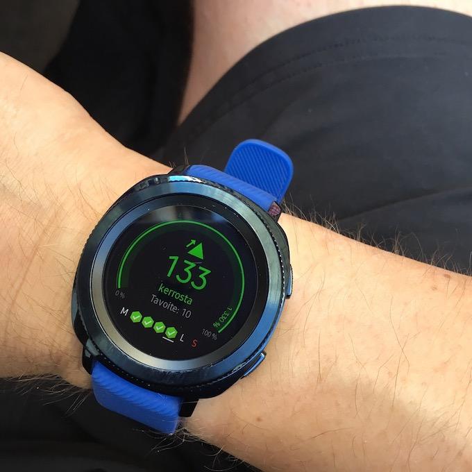 Gear Sport motivoi käyttäjäänsä sitä mukaa, kun asetettu päivittäinen askeltavoite (testin aikana 10 000 askelta) täyttyy. Kun tavoite on saavutettu, kello kiittää käyttäjää ja luo näin mukavan fiiliksen saavutetusta liikuntasuorituksesta.