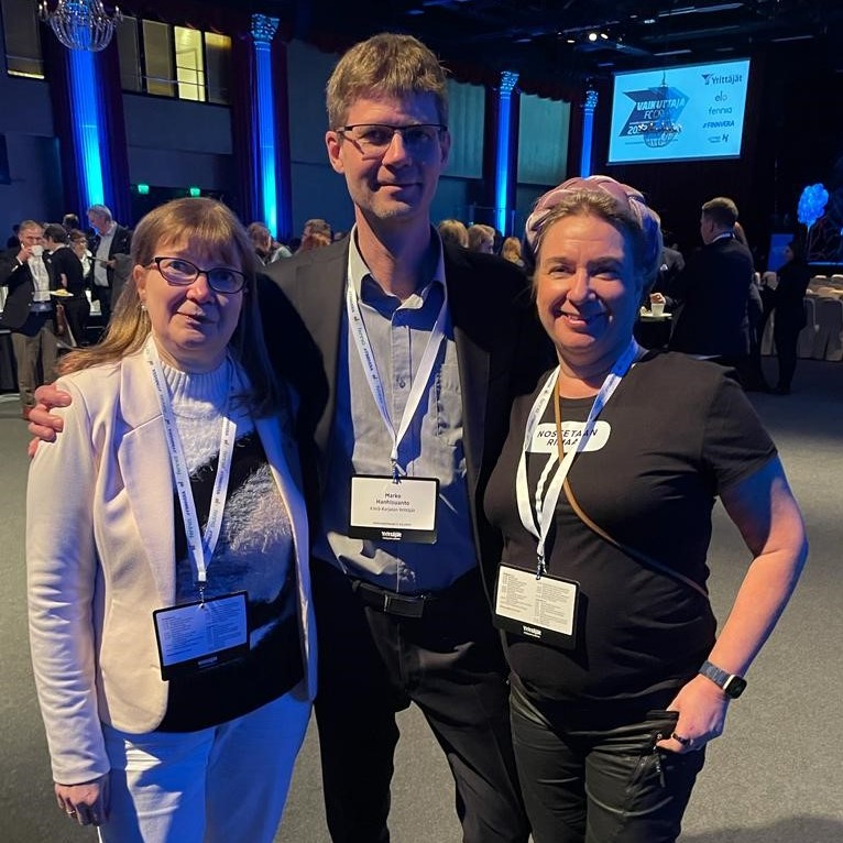 Kuvassa Vaikuttajafoorumissa Lappeenrannassa Holiday Clubissa vaikuttamassa Kauniaisten Yrittäjien puheenjohtaja Kia Katarina Järvinen ja Espoon Yrittäjien puheenjohtaja Päivi Repo tilaisuuden isännän Etelä-Karjalan Yrittäjien toimitusjohtaja Marko Hanhisuannon kainalossa.