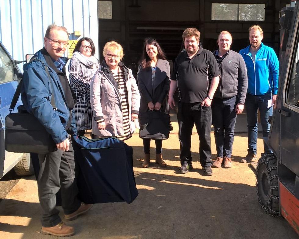 KETTU-ryhmä ja yritysten edustajat Pieksämäellä 19.4.2018 PHK Works Oy:llä: Veli-Matti Kokkonen, Eila Avelin, Leila Rapo-Jääskeläinen, Heidi Lampinen ja Jukka-Pekka Keronen. Yrittäjät Aleksi Mäkelä ja Tommi Häkkinen. Kuvaajana Pekka Sillanpää. |
