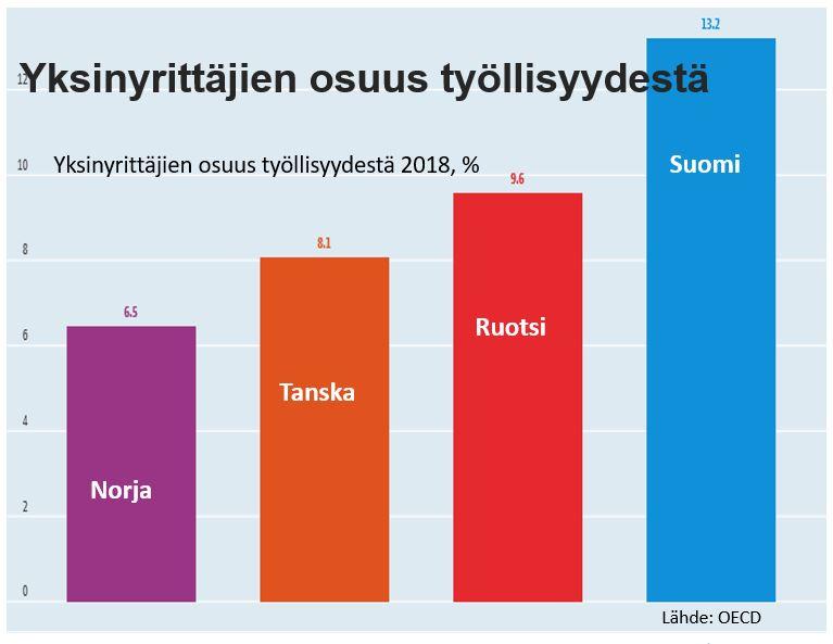 Yksinyrittäjien osuus työllisyydestä on Suomessa suurempi kuin muissa Pohjoismaissa. Suomessa osuus on OECD:n tilastojen mukaan 13,2 %, Ruotsissa 9,6%, Tanskassa 8,1% ja Norjassa 6,5%.