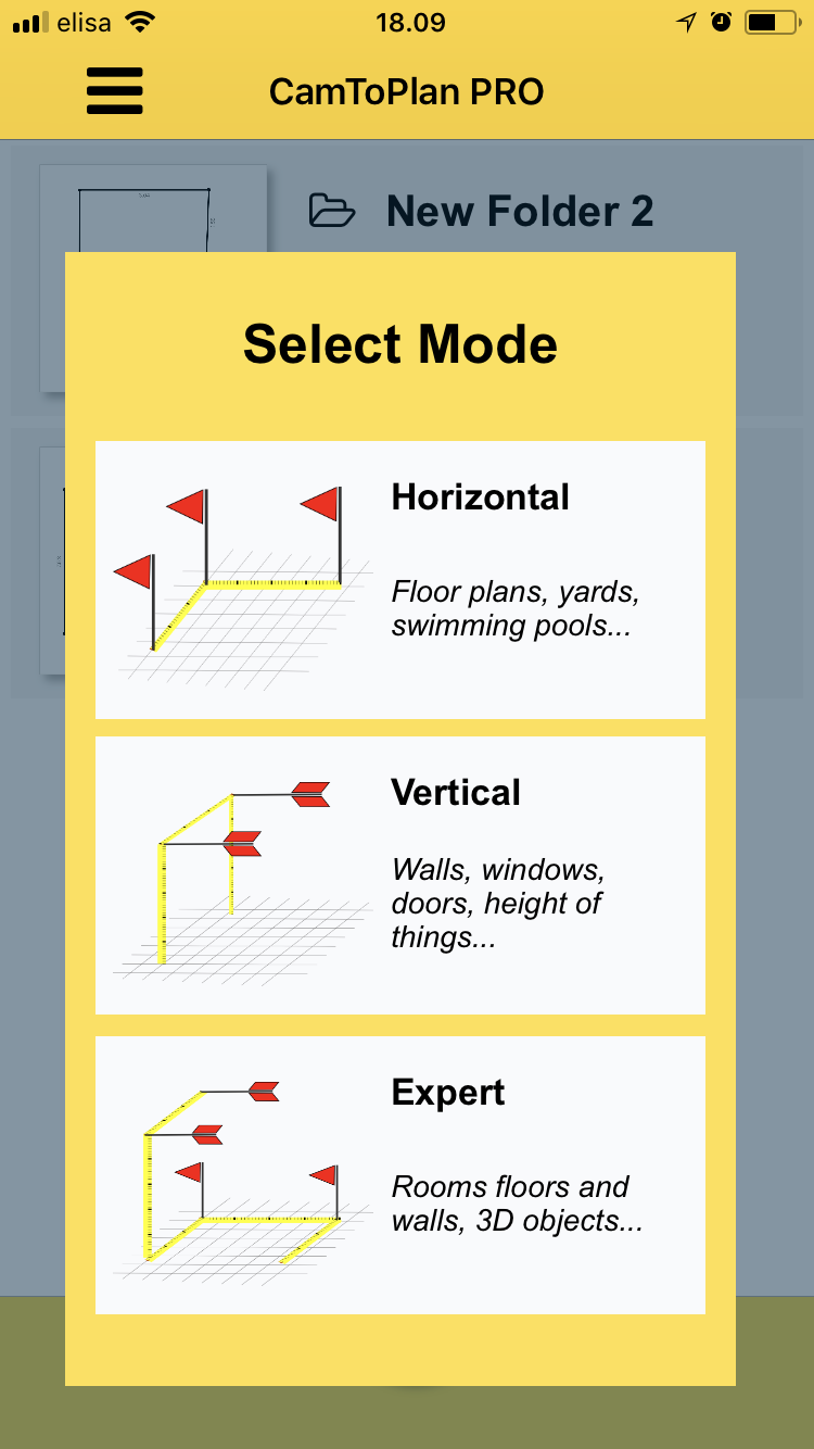 Ennen mittaamisen käynnistämistä sovellus pyytää valitsemaan kolmen toiminnon välillä. Valittavana on horisontaalinen ja vertikaalinen mittaus sekä expert-moodi, joka mittaa pintoja 3D-tilassa.