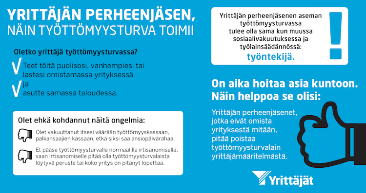 Suomen Yrittäjät esittää hallituksen kuluvan kevään kehysriiheen, että yrittäjän käsite tulee muuttaa työttömyysturvassa vastaamaan yrittäjän eläkelain määritelmää. Ongelma koskee vähintään noin 22000 yrittäjän ei-omistavaa perheenjäsentä. Lisäksi lukuisat yrittäjät eivät tällä hetkellä uskalla rekrytoida työtöntä perheenjäsentään sosiaaliturvan menettämisen pelossa.