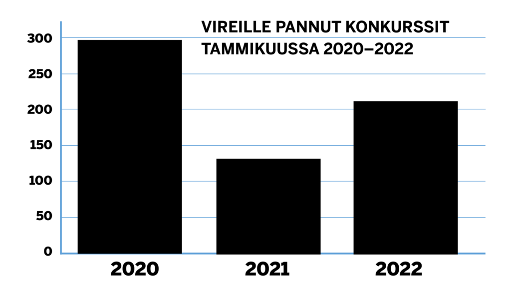 Tilastokeskus on julkaissut uusimmat tietonsa konkurssien määrän kehityksestä. Sen tietojen mukaan tammikuussa 2022 pantiin vireille 212 konkurssia, mikä on 81 konkurssia, eli 61,8 prosenttia enemmän kuin edellisvuoden tammikuussa.