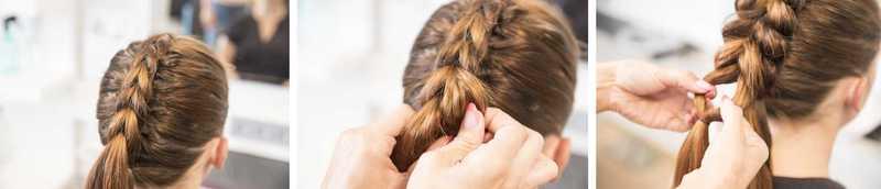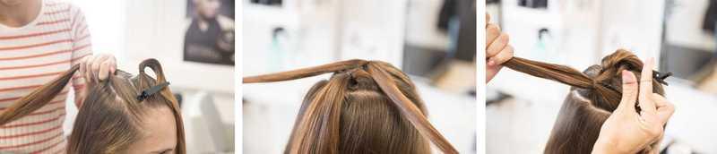 6.-7. Letitä läpivetotekniikalla loput hiuksista. Lisää päällimmäiseen osioon kumilenkki, jaa kahtia ja vedä alimmainen osio läpi.
