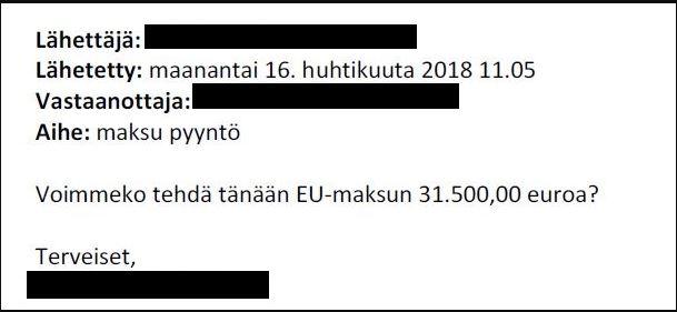 Helsingin poliisille tehtiin keväällä kymmenkunta rikosilmoitusta tapauksista, joissa yhdistysten tai yritysten talousvastaaville oli lähetetty toimitusjohtajana esiintyen huijaussähköposti, jossa vaadittiin pikaista maksua ulkomaalaiselle tilille.