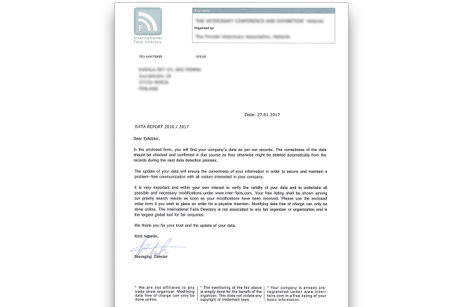 Suomalaisyrittäjälle lähetetty yhteystietojen kyselylomake olikin mainostilaus, joka johti vuosia kestäneeseen, Etelä-Amerikkaan asti ulottuneeseen lasku- ja perintäkirjeiden tulvaan. Hän kiittelee Suomen Yrittäjien lakineuvontaa tilanteen ratkaisemisessa.