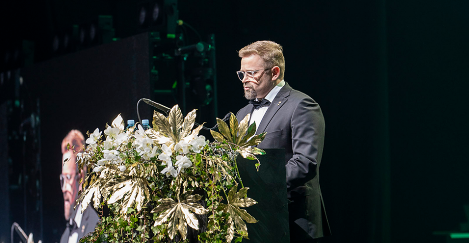 Varsinais-Suomen Yrittäjien puheenjohtaja Toni Forsblom kiitti Varsinais-Suomen Yrittäjägaalan juhlapuheessaan yrittäjiä ja taustavoimia. Hän toivoo, että vuoden 2024 Yrittäjägaala muistetaan talouden ja mielialojen käännekohtana.