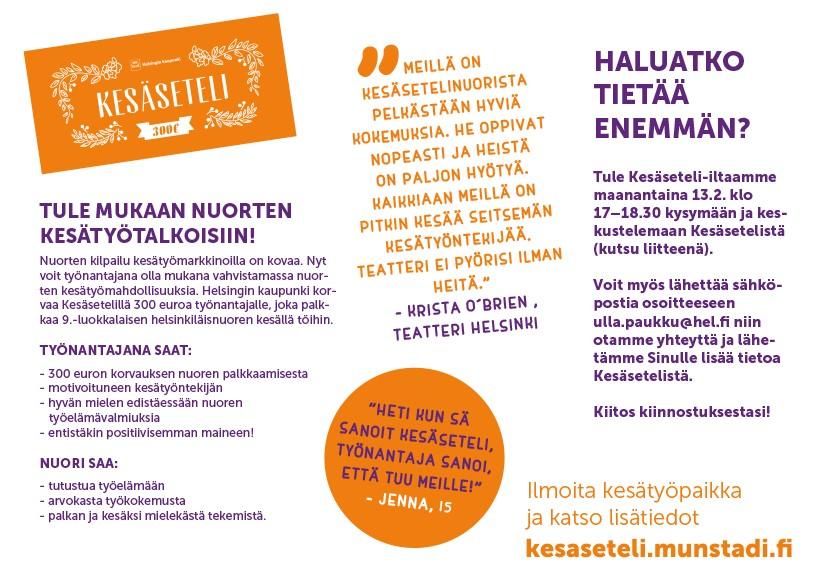 Kesäseteli on nuorten, yrittäjien ja Helsingin kaupungin yhteinen hanke, jolla tuetaan nuorten kesätyöllistymistä. Kesäsetelin saavat vuonna 2017 kaikki Helsingin koulujen 9.-luokkalaiset. Kesäsetelin arvo on 300 euroa, ja Helsingin kaupunki korvaa summan palkkakuluista työnantajalle.