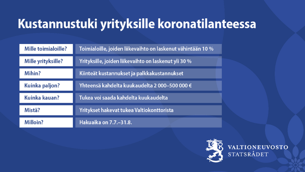 Kustannustuen ehtona on se, että yrityksen toimialan myynti on koronaviruksen vuoksi pudonnut vähintään 10 prosenttia vertailuajankohtaan nähden. Kustannustukea voi hakea, vaikka yritys olisi jo saanut muita suoria tukia koronatilanteessa, mutta nämä tuet vähennetään kustannustuesta. HUOM, hakuaika päättyy 31.8.2020. Lisätietoa täältä.