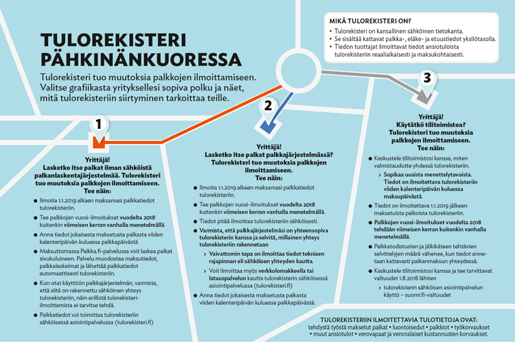 Tulorekisterin myötä yritysten ja yrittäjien antamat erilaiset viranomaisilmoitukset tulevat poistumaan. Tilalle tulee yksi ilmoitus, jonka nimi on tulorekisterin palkkatietoilmoitus. Useat palkkajärjestelmät rakentavat parhaillaan tulorekisteripäivityksiä, ja jos omasta palkkajärjestelmästä on rakennettu sähköinen yhteys tulorekisteriin, tiedot siirtyvät hyvin vähällä vaivalla tulorekisteriin.