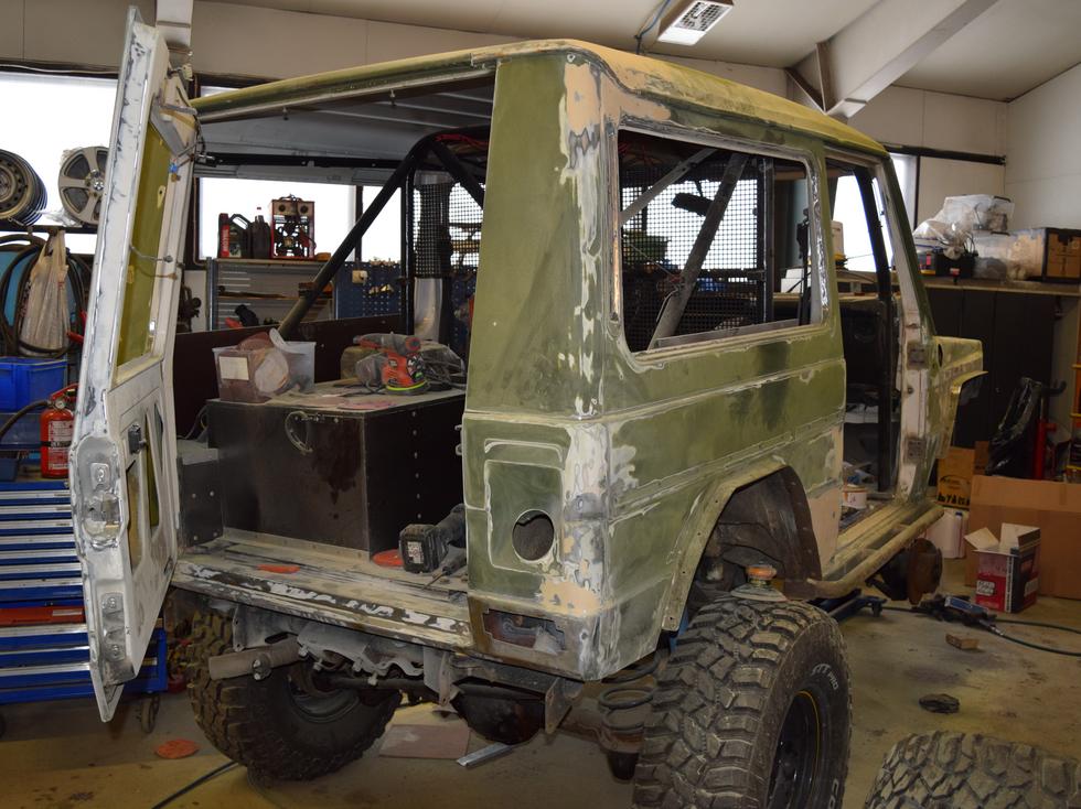 Hallin nurkassa seisoo kiinnostavan näköinen autoaihio, Mercedes se selvästikin on, maastopeli, joka on riisuttu aivan alkutekijöihinsä.