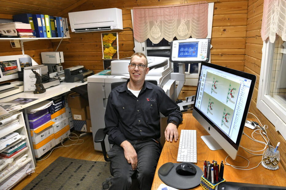 Eurajokelainen Tuomas Saloma on pyörittänyt omaa graafisia painotuotteita tarjoavaa yritystään jo 15 vuotta. Yrittäjyys on ollut Salomalle välttämättömyys, sillä hän ei olisi CP-vammansa takia muuten työllistynyt.