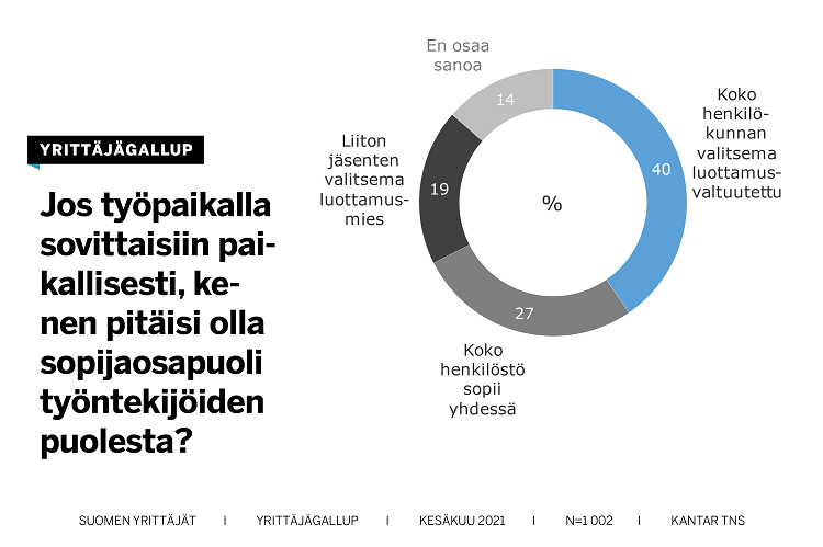 – Luottamusvaltuutettu edustaa koko porukkaa, ei vain liiton jäseniä, joita on monilla työpaikoilla entistä vähemmän. Luottamusvaltuutettua kannattaa hyödyntää, koska hänellä on työpaikoilla laajaa kannatusta, Suomen Yrittäjien toimitusjohtaja Mikael Pentikäinen sanoo.