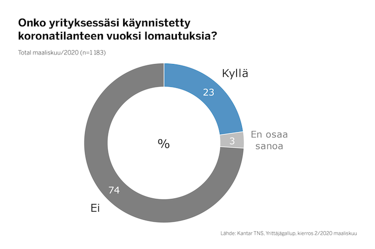 Vaikka kriisi on vasta puhjennut, jo 35 prosenttia työnantajavastaajista kertoo joutuneensa aloittamaan työntekijöiden lomautukset. Tämä tarkoittaa noin 35 000 työnantajayritystä. Eniten on lomautettu kaupan alalla ja toiseksi eniten teollisuudessa.