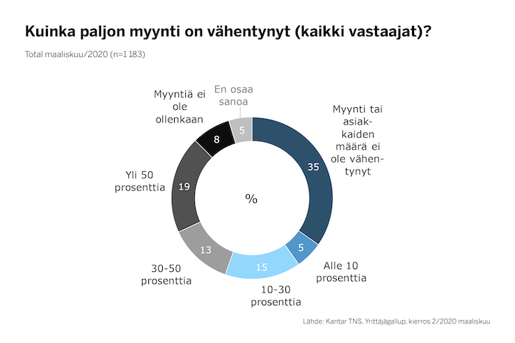 Kantar TNS selvitti vaikutuksia Suomen Yrittäjien pyynnöstä. Vastaajia oli kaikkiaan 1183. Kysely tehtiin 18.–24.3.2020. Tuloksissa eivät näy vielä hallituksen tuoreimpien rajoitustoimien vaikutukset.