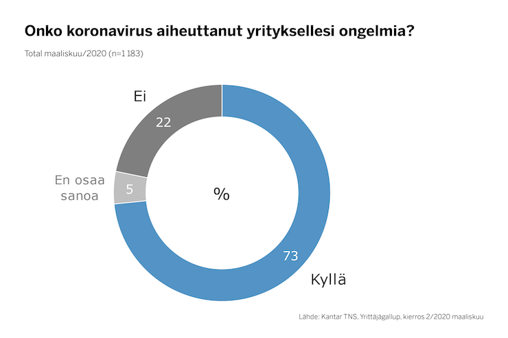 Yrittäjägallupin mukaan 73 prosenttia yrityksistä on ongelmissa koronan takia. Maksuvaikeuksissa on runsaat 20 prosenttia.
