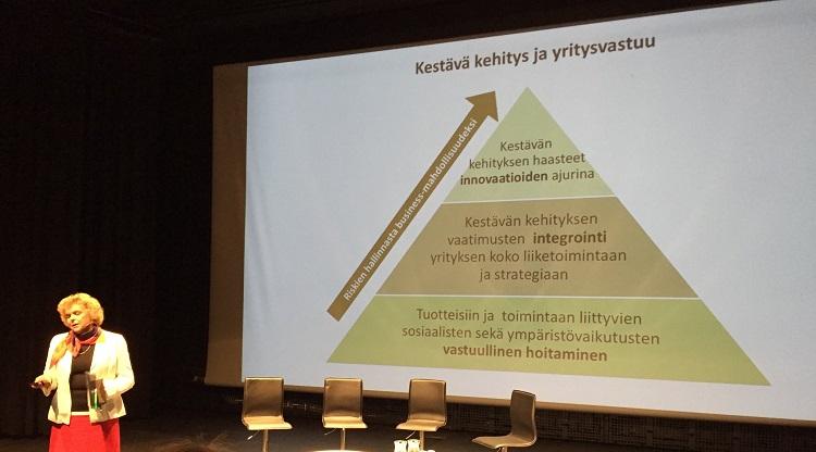 – Jos haaste ei ole siinä, että ylin johto ei ole sitoutunut, eikä kustannuksissa eikä osaaminenkaan ole haaste. Miten se haaste voi olla, että me yritykset emme saa vietyä näitä asioita strategiaan. Nyt pitää miettiä, pitäisikö yksinkertaistaa, pitäisikö mennä pienin askelein eteenpäin. Voi edetä ns. inside out, eikä outside in, eli aloittaa siitä, että mitä se vastuullisuus meidän yritykselle on ja mitä se meille tuo.