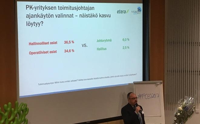 – Kun pienyrityksen toimitusjohtaja on asiakkaissa, hän on modernin liikkeenjohdon kannalta juuri siellä, missä pitääkin olla. Mutta osaako hän käyttää se ajan yrityksensä strategian tekemisen, Jurttila havainnollisti.