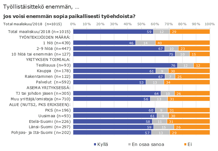 Yksinyrittäjät ovat varovaisimpia työllistäjiä, heistä 46 prosenttia uskoo työllistävänsä enemmän, jos saisivat sopia paikallisesti työehdoista. Kaikista yrityksistä 29% ei työllistäisi enempää kuin nykyisin.