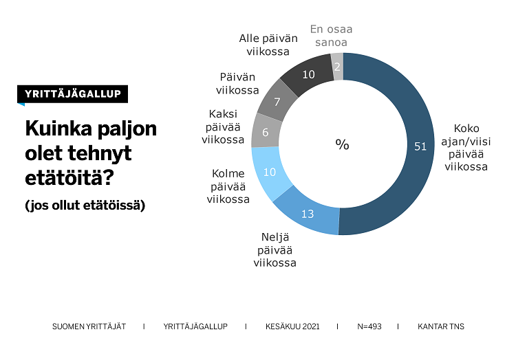 Tutkimuslaitos Kantar on selvittänyt työelämässä olevien näkemyksiä etätyöstä Suomen Yrittäjien toimeksiannosta useita kertoja. Vastaajat ovat palkansaajia, yrittäjiä, työttömiä tai lomautettuja.