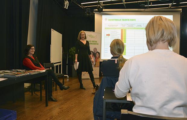 Yksi vinkeistä oli Tavoitteella tulosta kohti -työkalu, joka löytyy myös Matka hyvään kuntoon -kampanjan nettisivuilta. Työkalun käyttämistä havainnollistivat Tarja Kostiainen ja Niina Brandenburg.