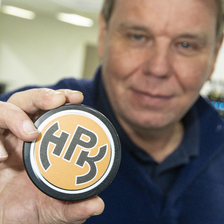 Artikkelin kuva: Arto Heina näyttää esimerkin, miten tasotulostimella voidaan printata logo suoraan tuotteen pintaan.