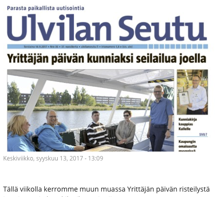 28.9.2017 klo 15:37 Uutinen #yrittäjänarki Ulvilan Yrittäjien hallitus kutsui Ulvilan kaupungin valtuuston ja johtoryhmän risteilylle Yrittäjän päivänä 5.9.2017 Tämä teksti on konekäännetty. Jaa Kopioitu leikepöydälle