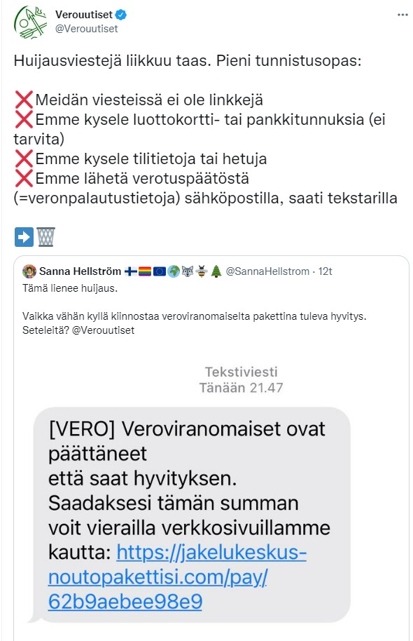 Verottaja kertoo pikaviestipalvelu Twitterissä pienen tunnistusoppaan, joilla voi yrittää välttää tulemasta huijatuksi.