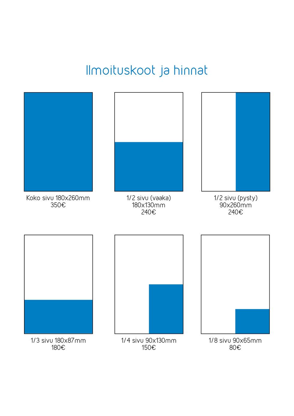 Ilmoitus hintahaitarilla 80 – 350 euroa + alv. Eri ilmoituskoot ja hinnat löytyvät alla.