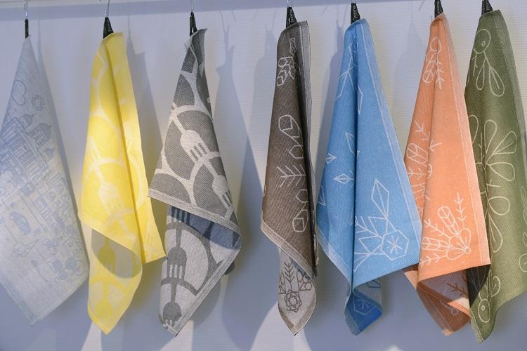 Kierros tehtaassa antaa hyvän kuvan toiminnan laajuudesta. Koneet ruksuttavat tänä syksynä lanseerattua Vappu Pimiän kanssa yhteistyössä suunniteltua kodintekstiilimallistoa. Lahjapakkauspöydällä on Satokausikalenterin keittiöpyyhkeet.