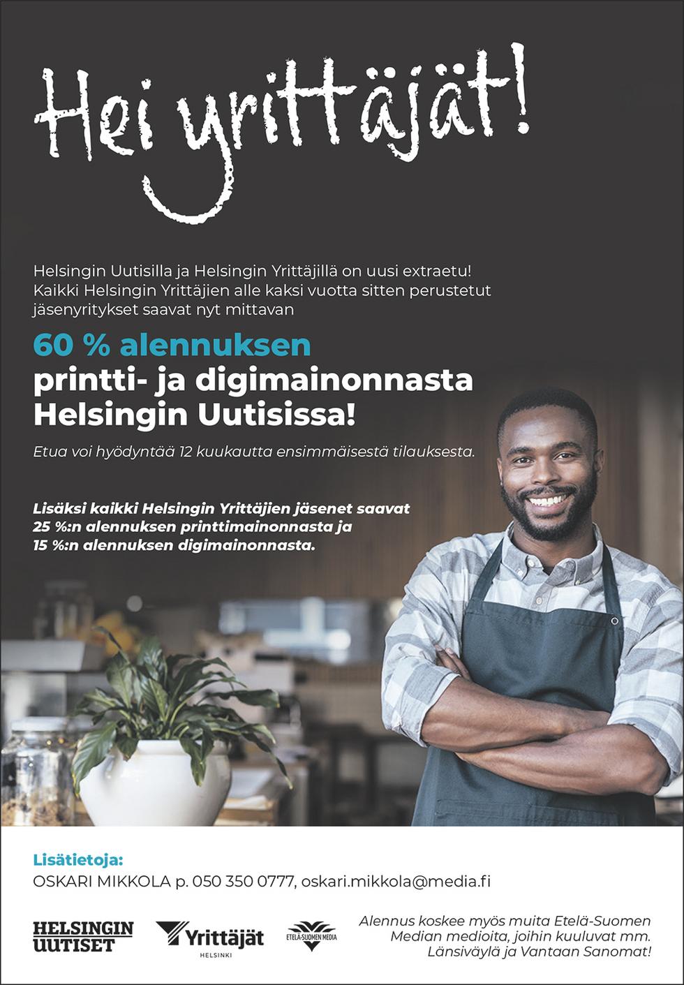 MAINOS | Helsingin Yrittäjät on sopinut yhteistyökumppaninsa Helsingin Uutisten kanssa uudesta extraedusta, joka koskee hiljattain perustettuja yrityksiä. Kaikki Helsingin Yrittäjien jäsenyritykset, jotka on perustettu maksimissaan kaksi vuotta sitten, saavat mittavan 60 % alennuksen printti- ja digimainonnasta Helsingin Uutisissa. Etua voi hyödyntää 12 kuukautta ensimmäisestä tilauksesta.