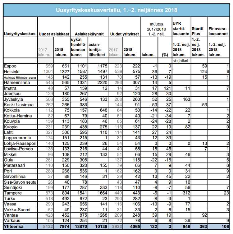 Eniten uusia yrityksiä, 575 kpl, perustettiin pääkaupungissa Helsingissä, kuten arvata saattaa. Toiseksi eniten niitä perustettin Tampereella (443) ja kolmannelle tilalle nousi Hämeenlinna (307) Kappalemääräisesti vähiten uusia yrityksiä perustettiin Imatran uusyrityskeskuksen alueella, mutta toisaalta Imatralla oli prosentuaalisesti komein kasvu, peräti 121 prosenttia. Alkuvuodesta 2017 perustettiin alueella 14 uutta yritystä, nyt niitä oli 31.